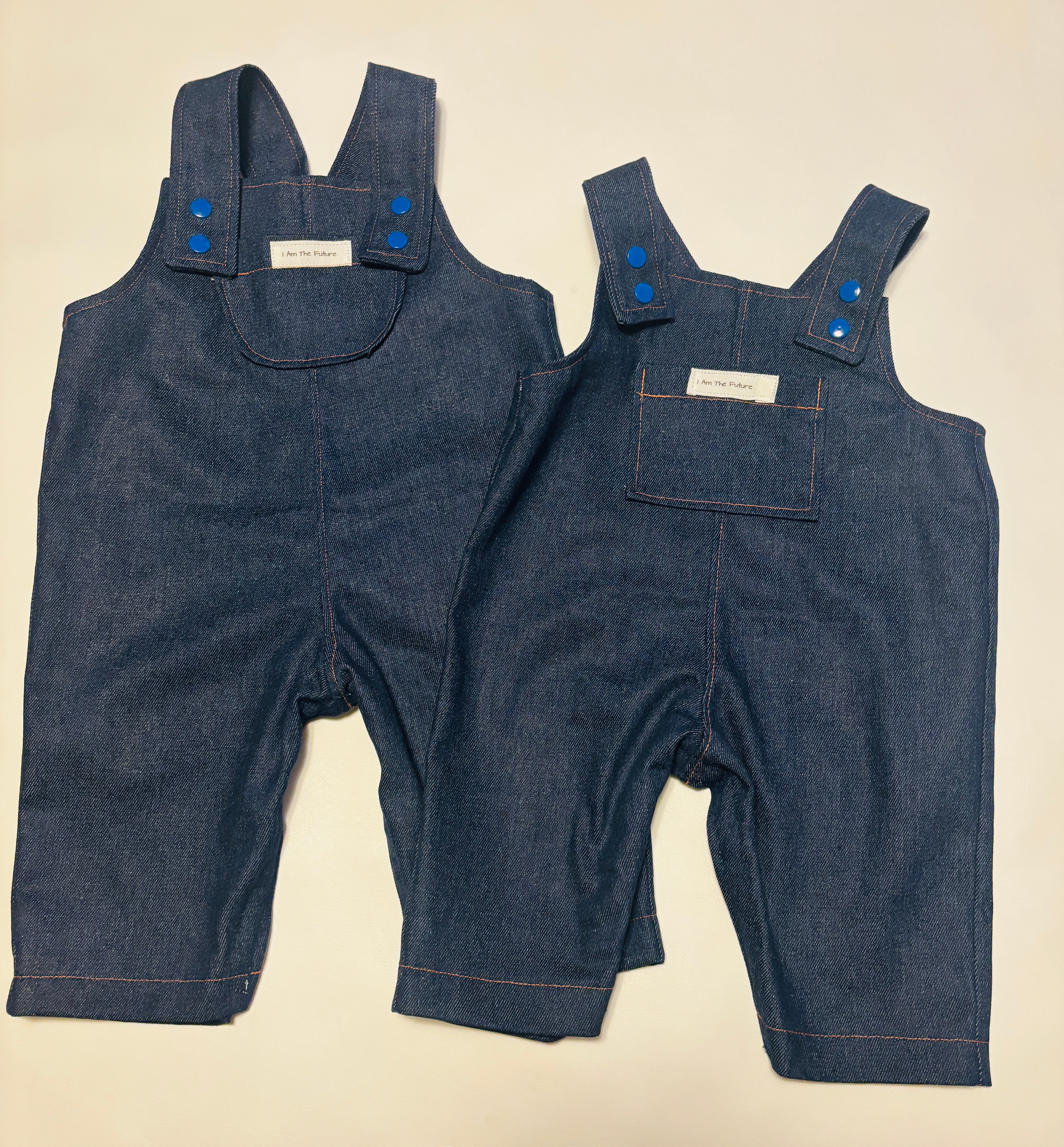 Denim overalls for baby. One upper front pocket, and two back pockets. Snap tape on inner legs, for easy changing. Shoulder straps have two snaps each, for shoulder adjustment. These are from the "I Am the Future" collection.