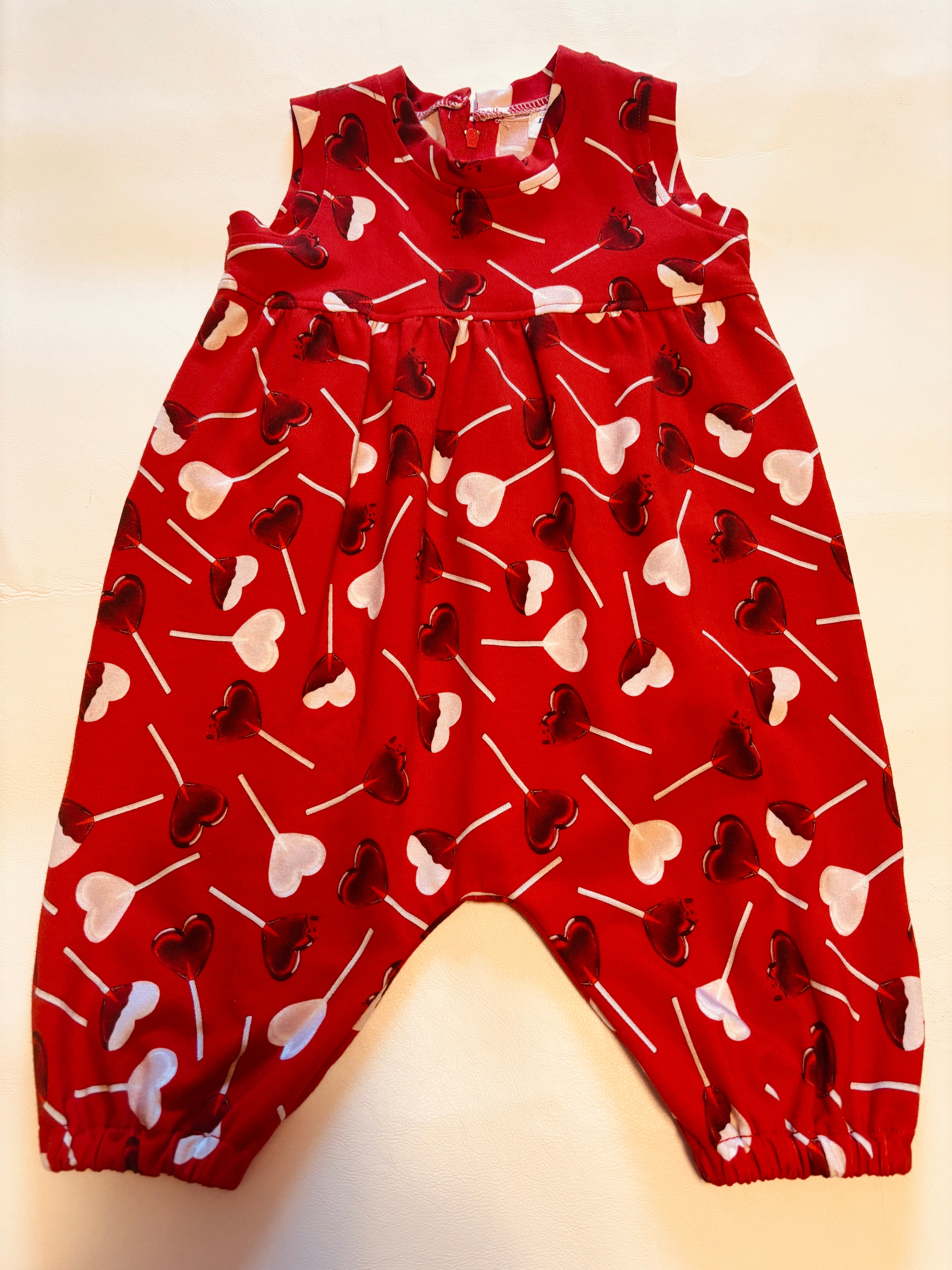 Cute little romper in red, with heart-shaped lollipops!  Empire waist-style.  Sleeveless.  Elasticized ankles.  Zipper back closure.  No crotch snaps.