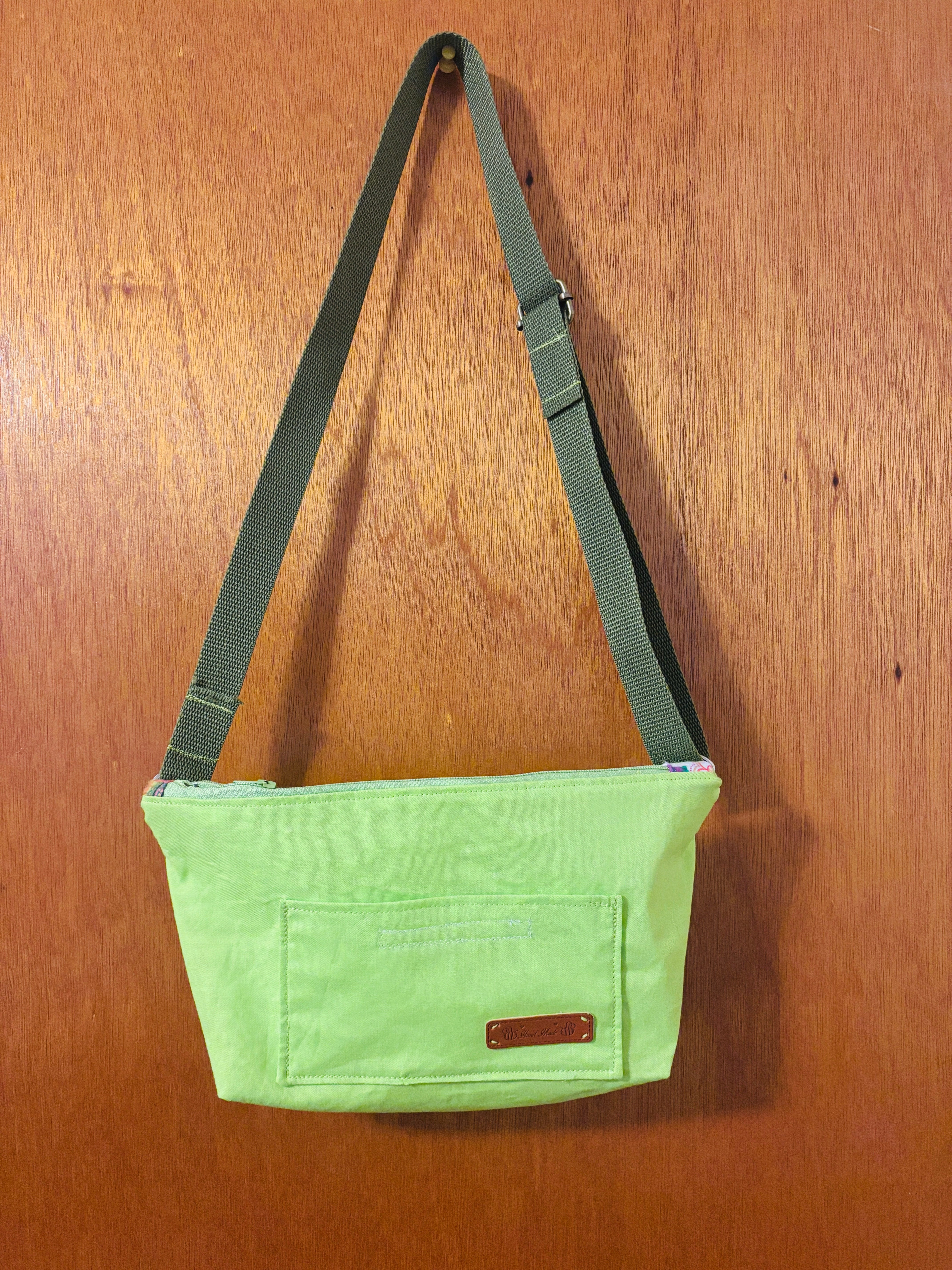 This is a small handbag - suitable for kids AND adults! Lime green woven (cotton) on the outside, and cotton flannel on the inside (colorful elephants print). One pocket inside, and one outside. Zipper closure. Long, adjustable webbed strap for hand carrying, shoulder carrying, or cross-body carrying.  Outside pocket has Velcro closure. No closure on inside pocket. Outside pocket measures 6 1/4" x 3 1/2"; i side pocket measures 5 1/4" x 4 1/4".