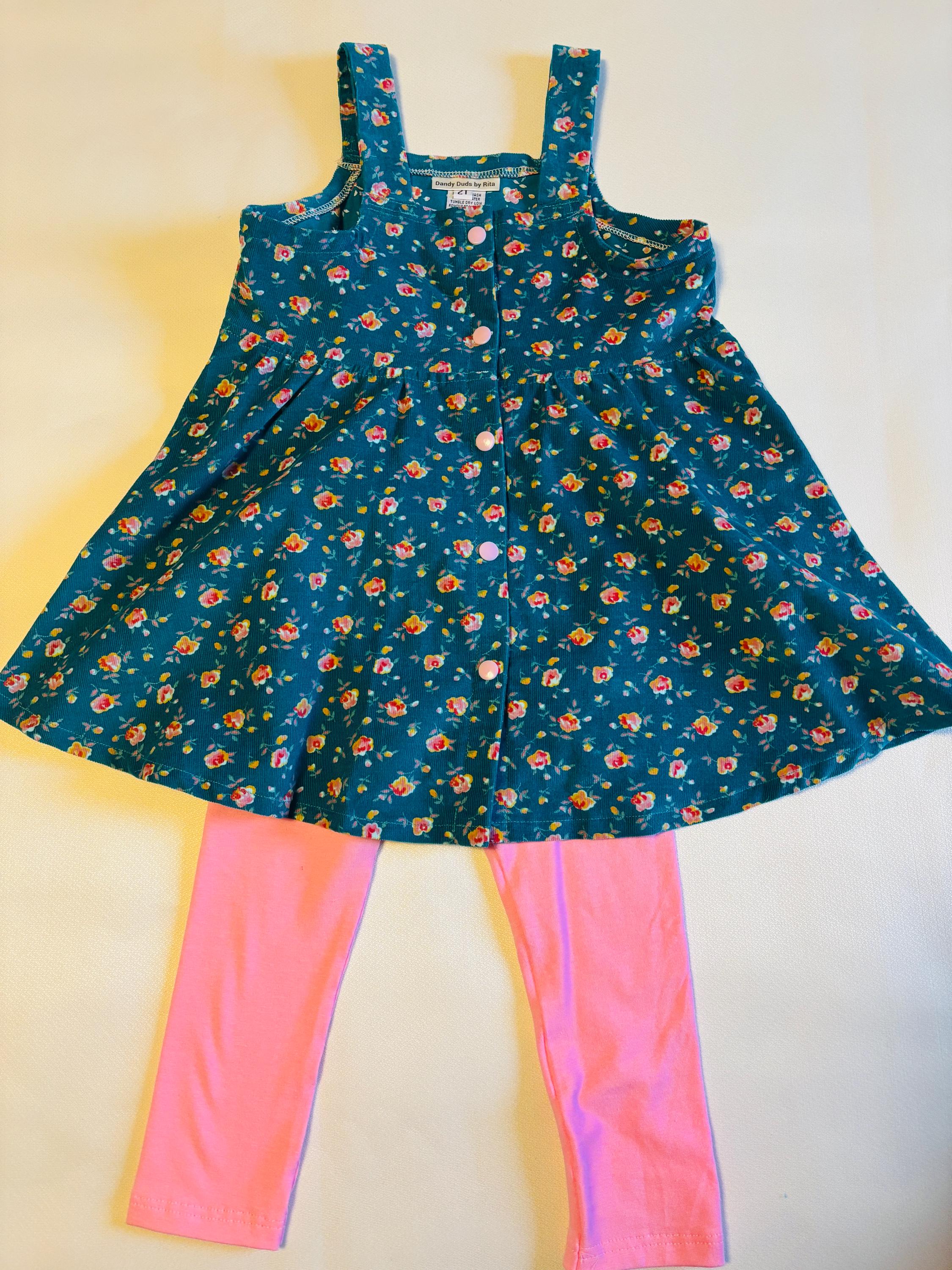Green corduroy jumper, with little flowers. Gathered skirt. Snap straps. Matching leggings in pink. The perfect fall or winter outfit!