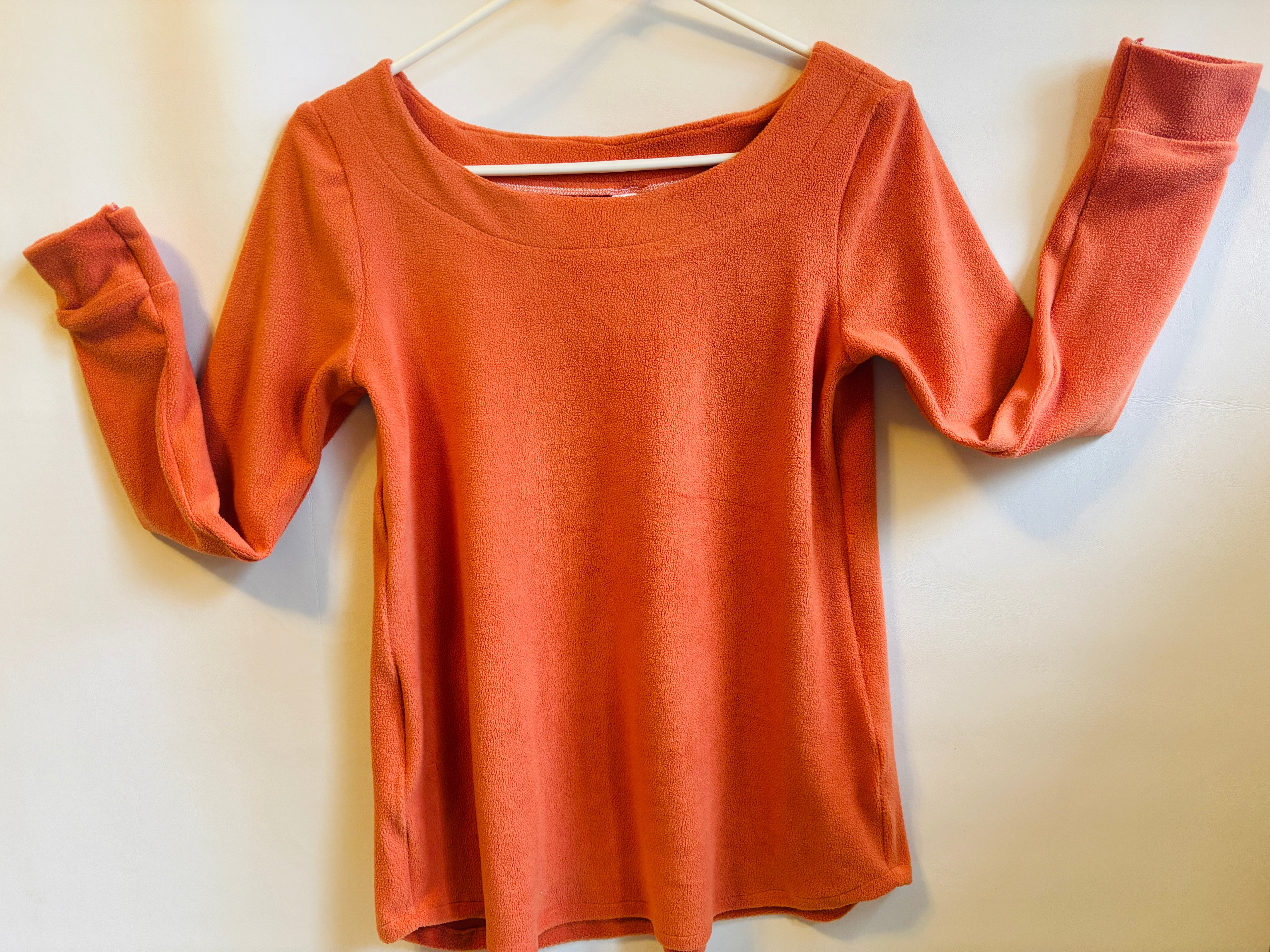 This is a warm and cozy top that looks like crushed fleece on the outside, but like a knit blend on the inside. Super soft! It has long, cuffed sleeves and almost a boat-style neckline. The neckline is self faced and sewn down.