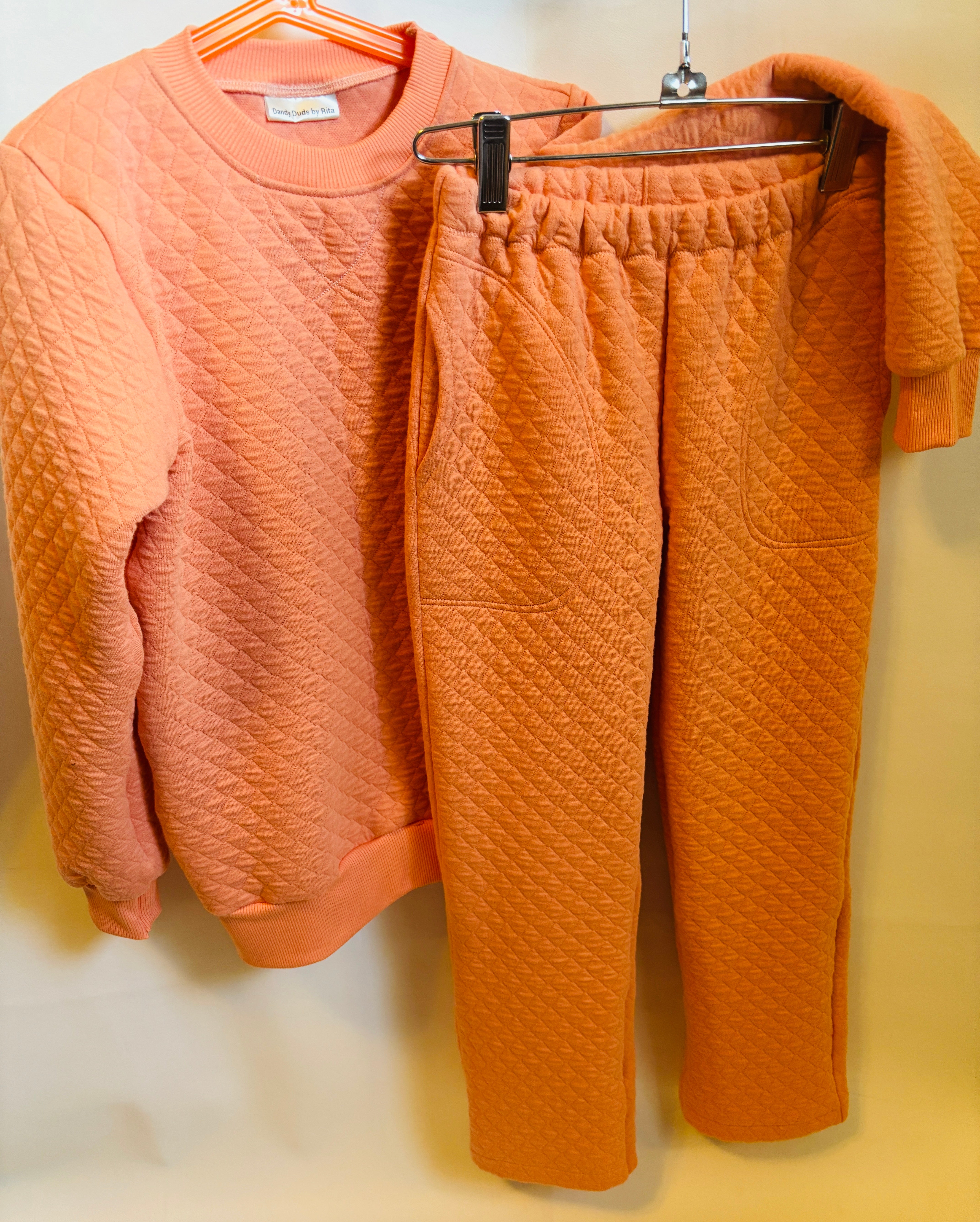 Salmon colored quilted knit sweatshirt and matching sweatpants create the perfect jogger set! Pants pockets have elastic waist and large pockets. Sweatshirt has crew neck and ribbed/cuffed sleeves. Soft and warm quilting on double-layered knit.