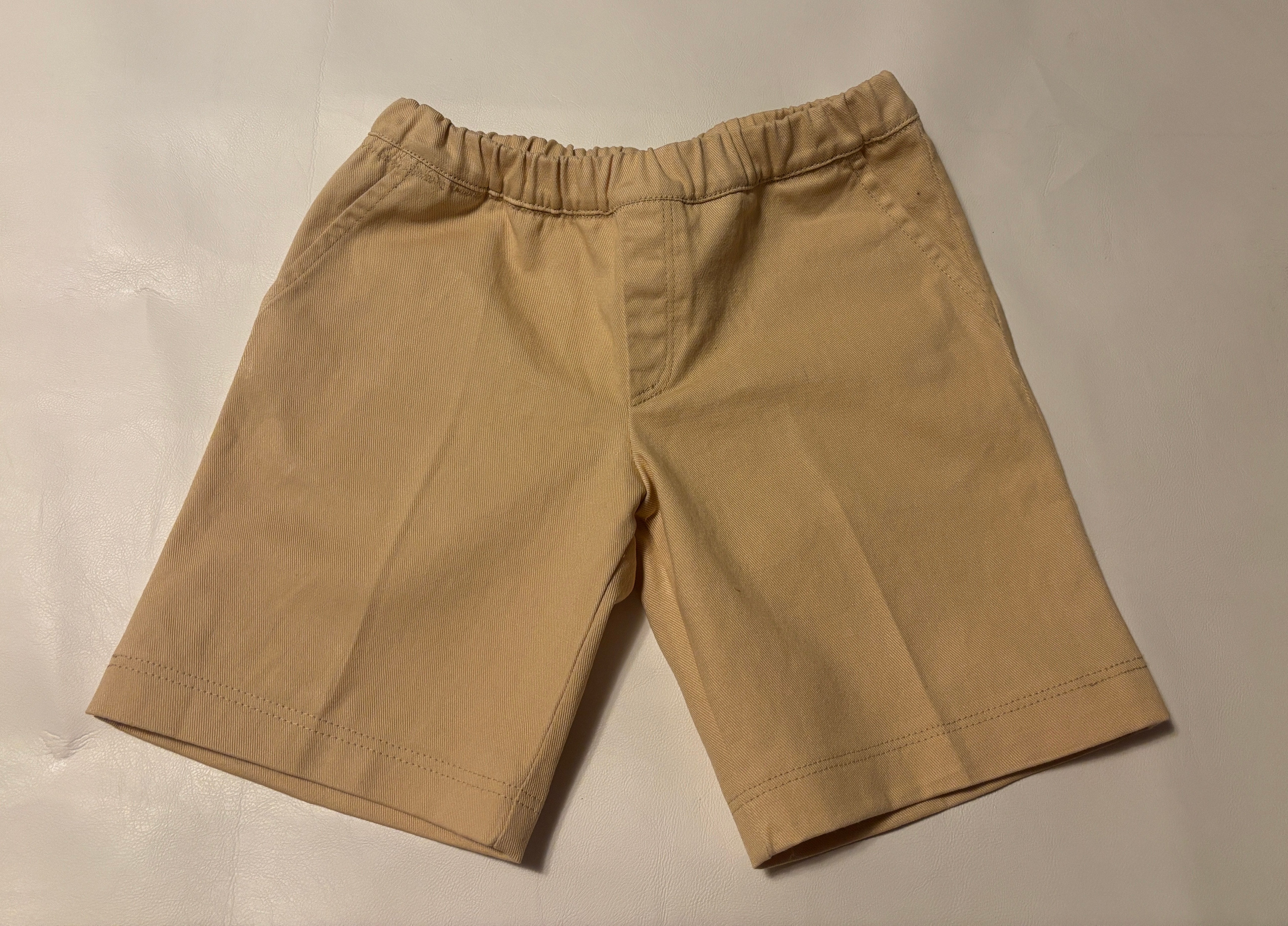 Midweight cotton khaki shorts.  Long shorts.  Two front pockets, two small back pockets.  Elastic waistband.  Perfect three-season shorts. Machine wash and dry:  wash on cool or cold, dry on warm. Size Small, 4-6 years.