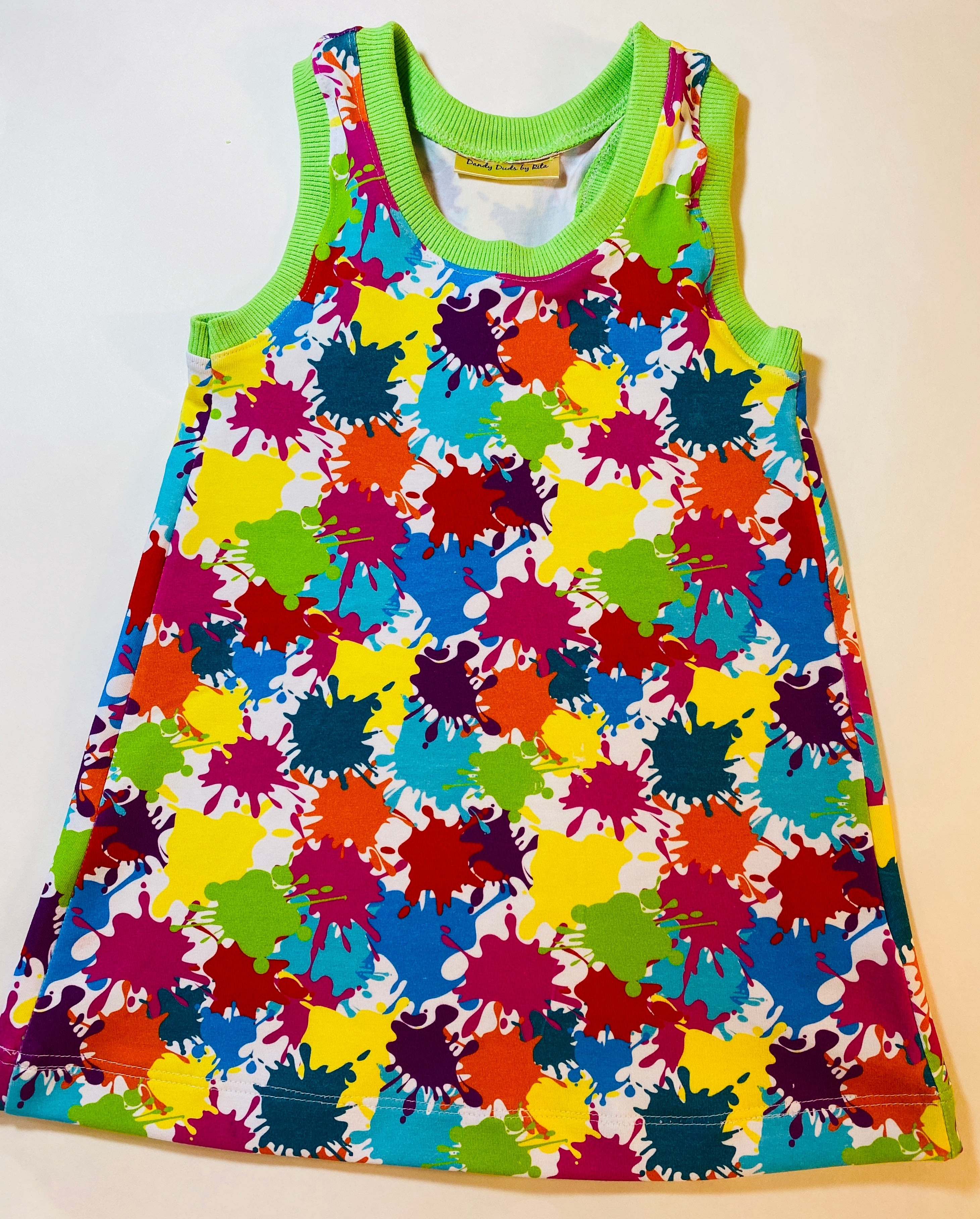 Cotton lycra knit is soft and so wearable! Racerback dress with lime green trim. Back gathers