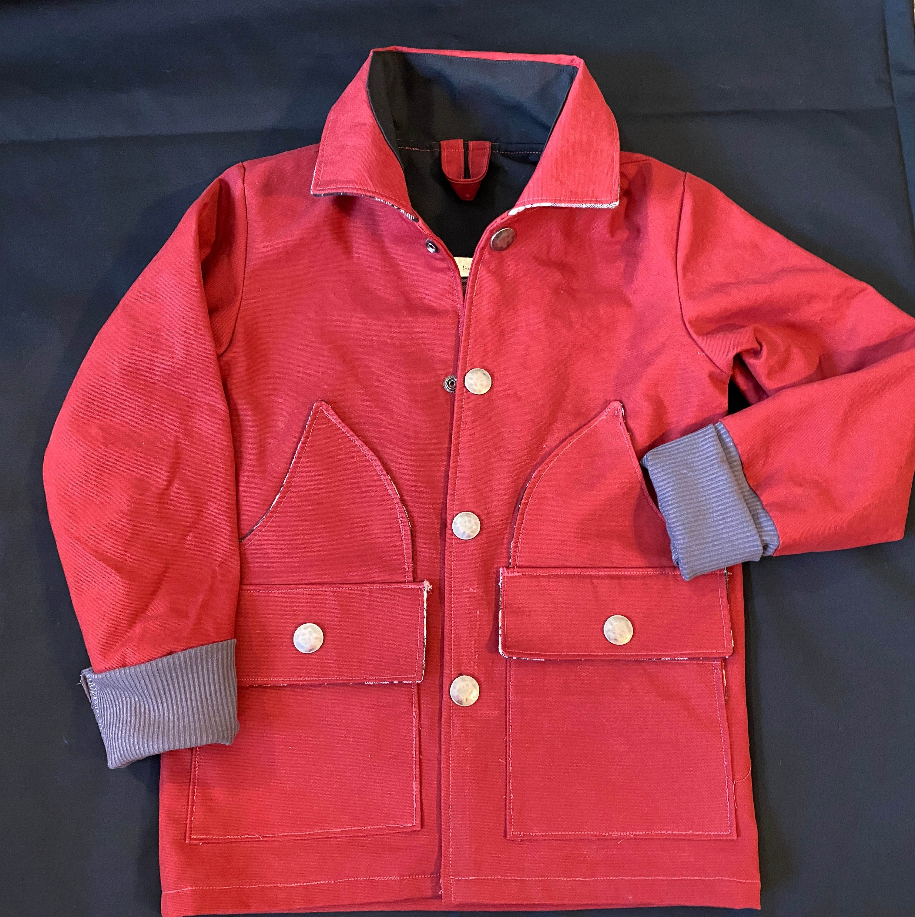 A farm/ chore/ work coat in the style of Carhartt. Lined with flannel. Lots of embellishments in this coat! Two large front pockets with lined flaps, and two hand-warming pockets nestled into the lower pockets. Inside pocket on right side.  Has hanging loop.  Comes in several colors